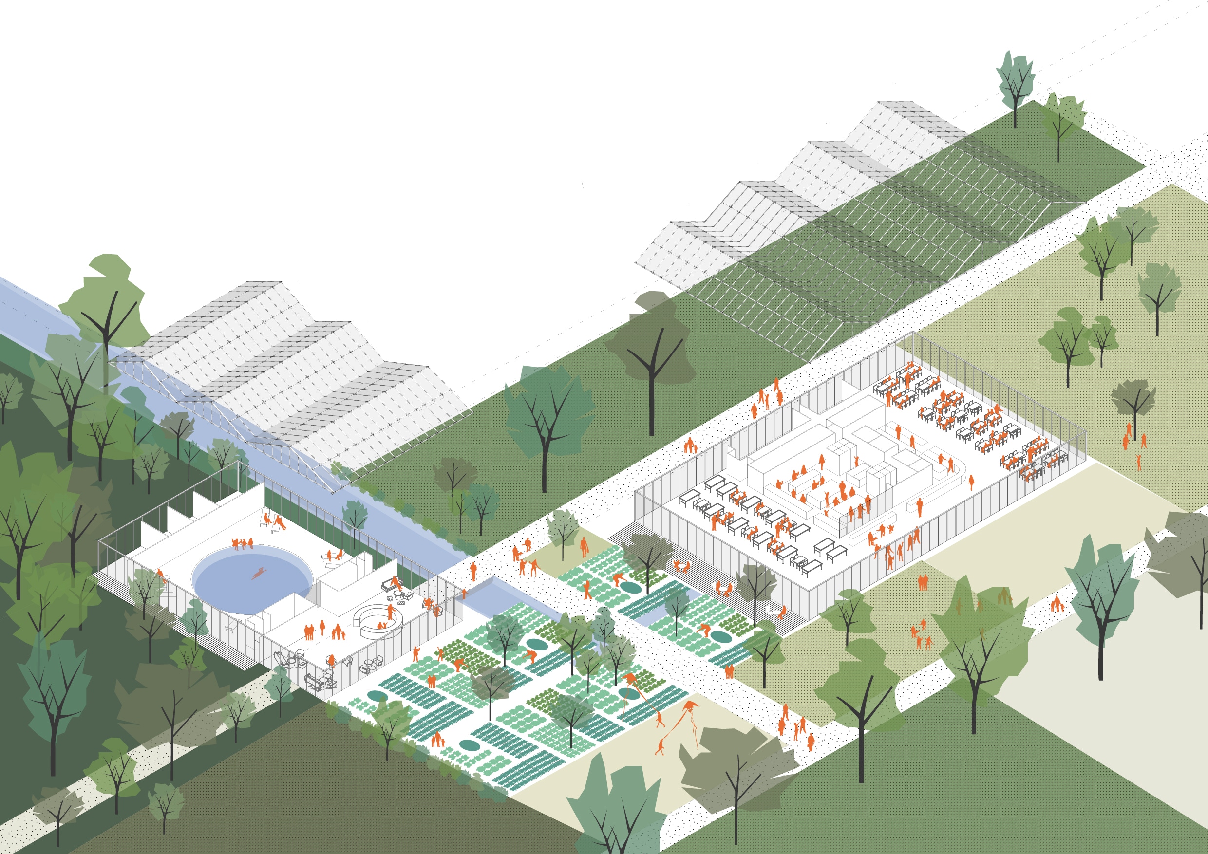 Le pôle gastronomique prend place plus loin, dans un cadre naturel au milieu d’une forêt. Le dispositif fonctionnel permet de produire, de cuisiner, et de manger dans cet endroit totalement autonome en fruits et légumes.