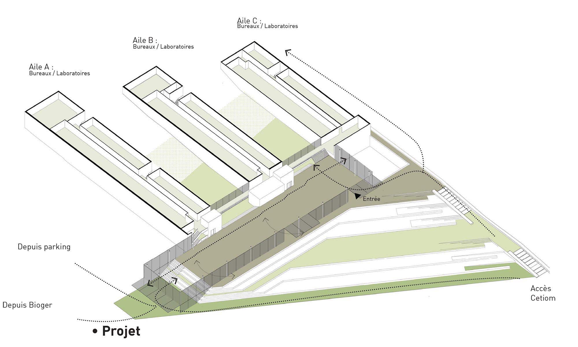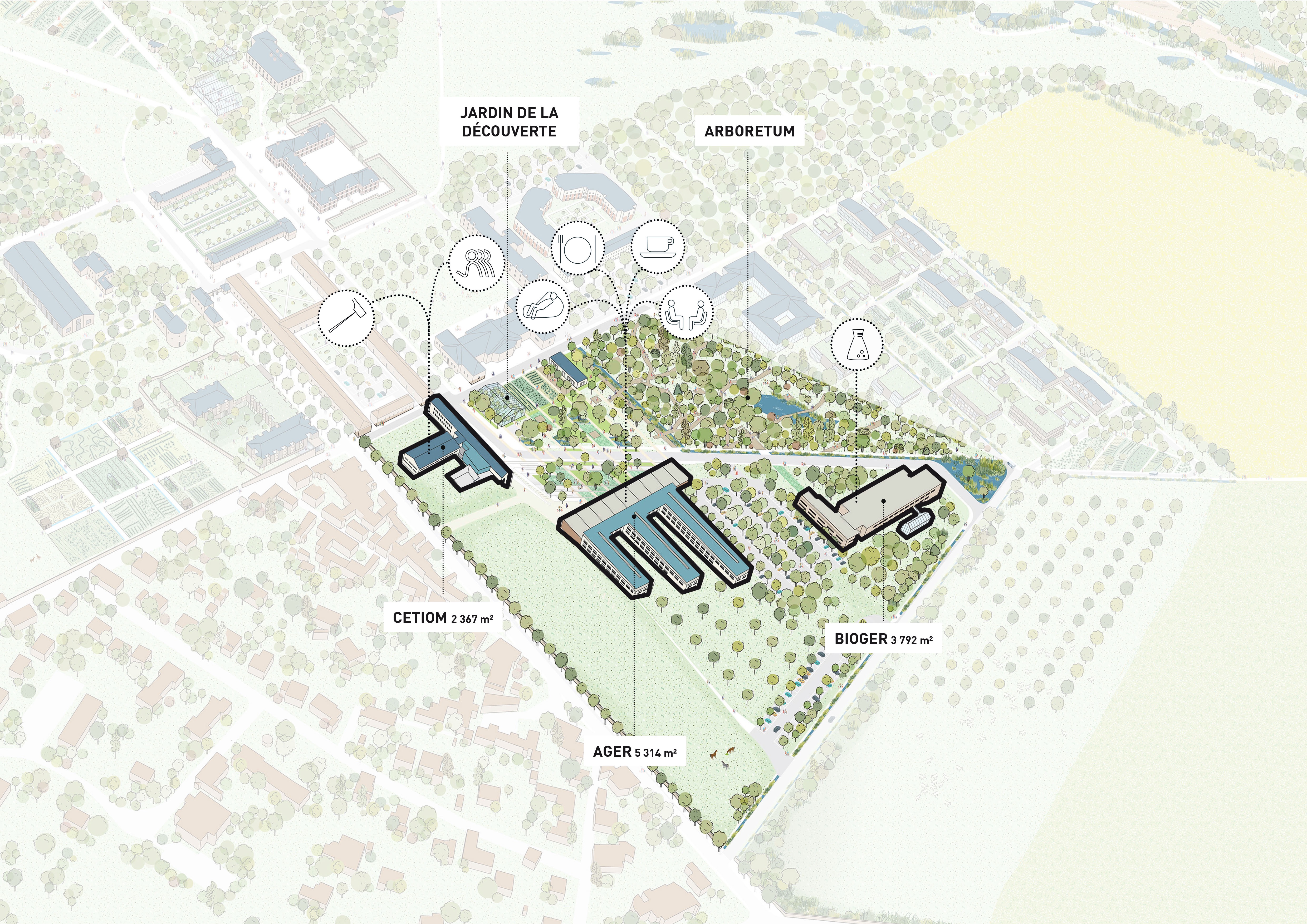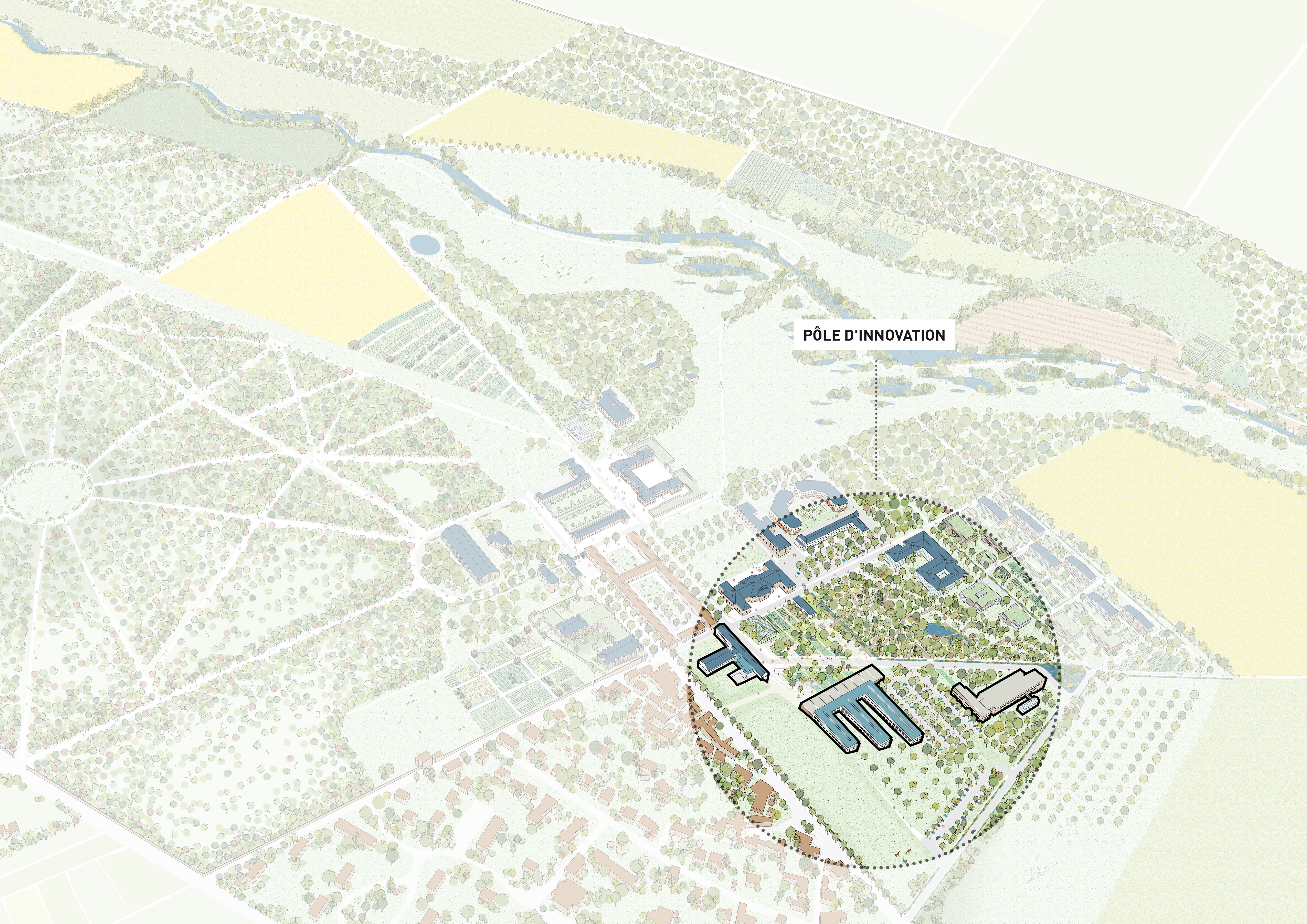 Le projet vise à réhabiliter ces laboratoires existants pour accueillir des acteurs des filières agricoles et environnementales, dans une démarche collaborative et innovante. L'accent est mis sur la création d'un écosystème dynamique, où unités de recherche, start-ups et entreprises privées peuvent interagir et innover ensemble, tout en respectant les contraintes et qualités du site.