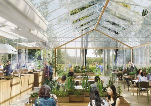 Le pôle gastronomique est conçu pour effacer les limites entre intérieur et extérieur, en offrant un lieu confortable malgré sa transparence.