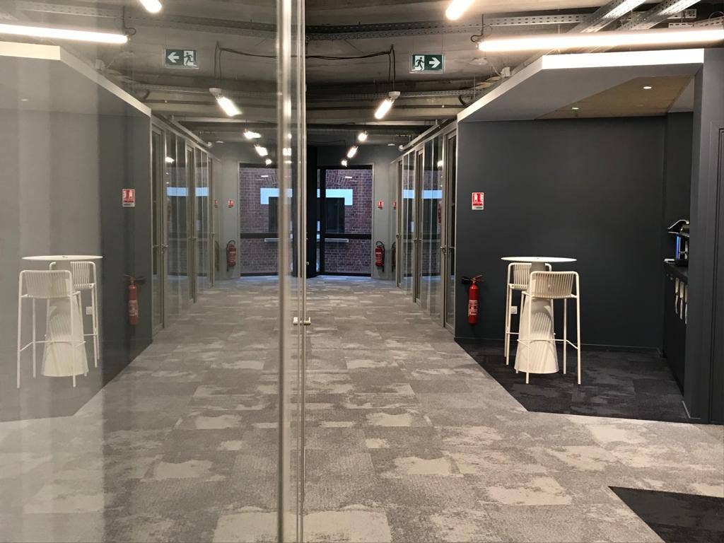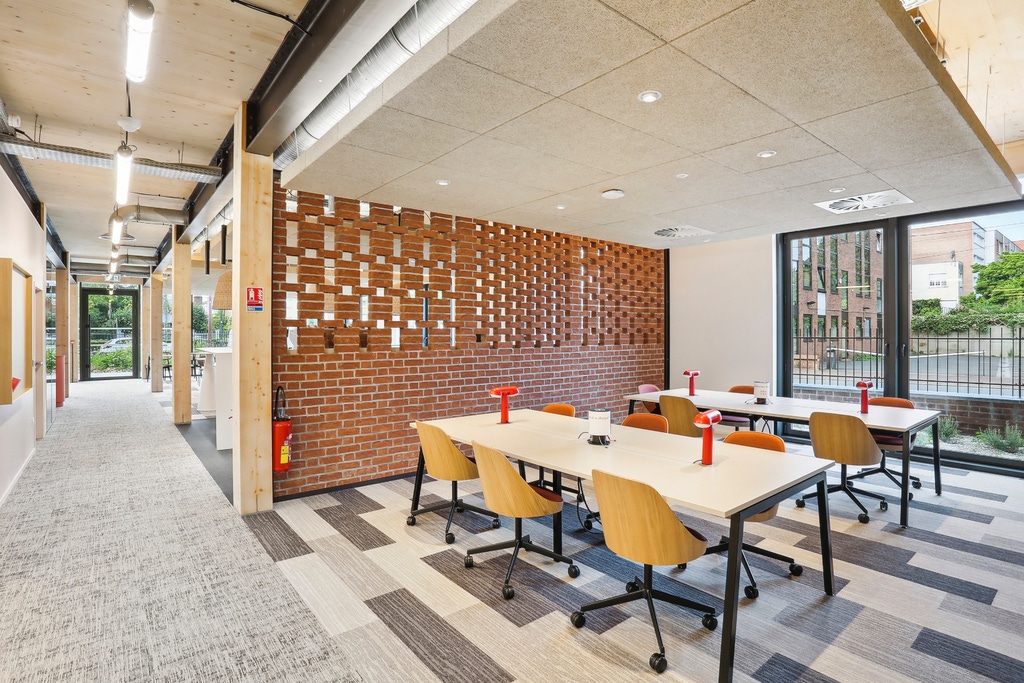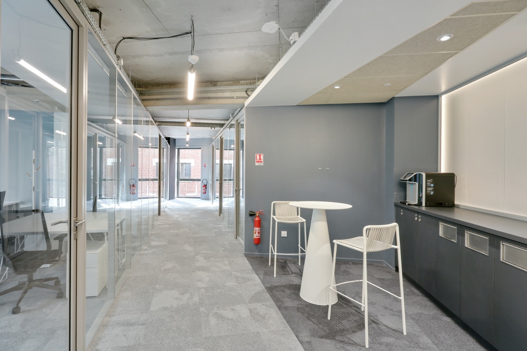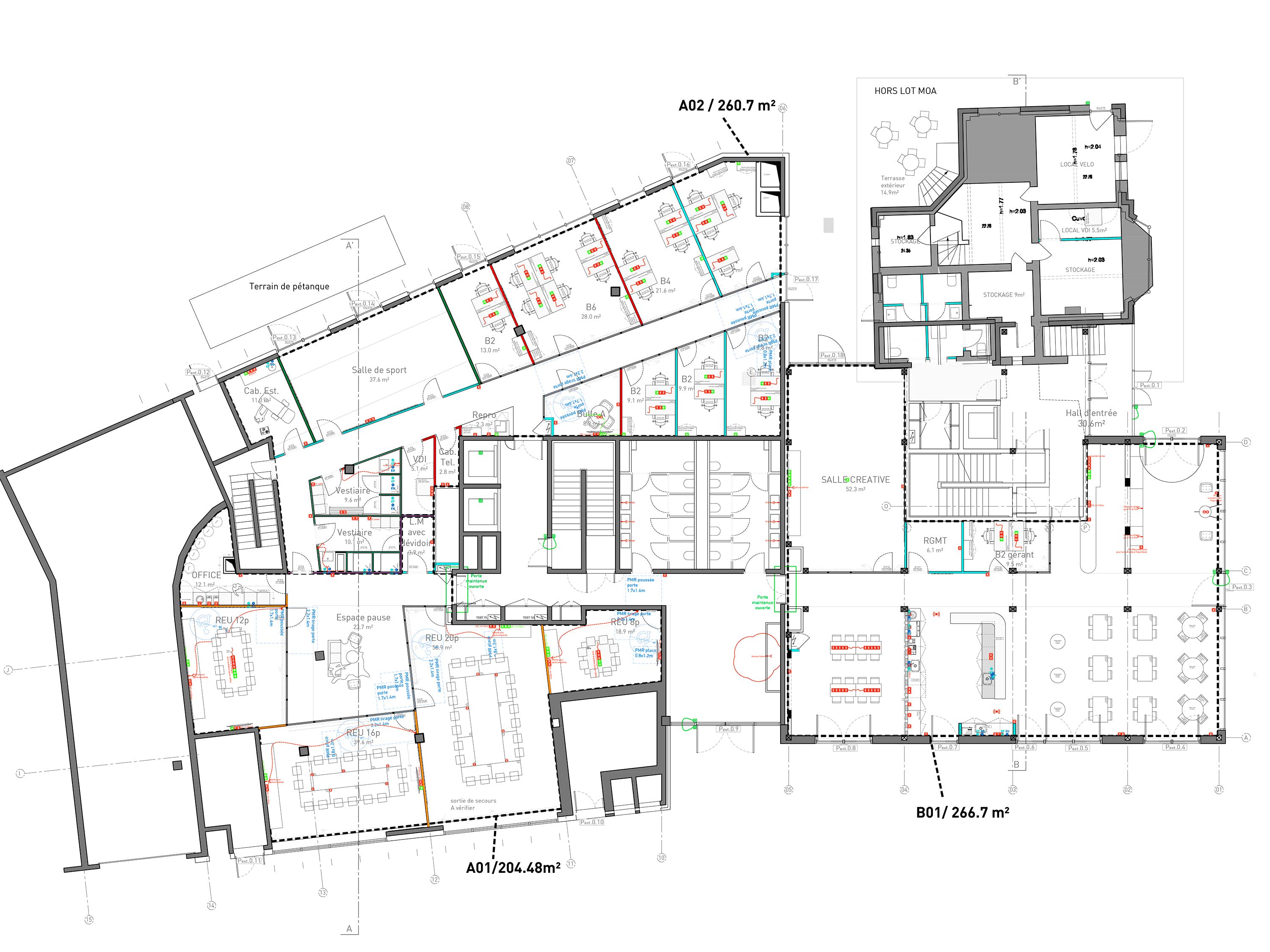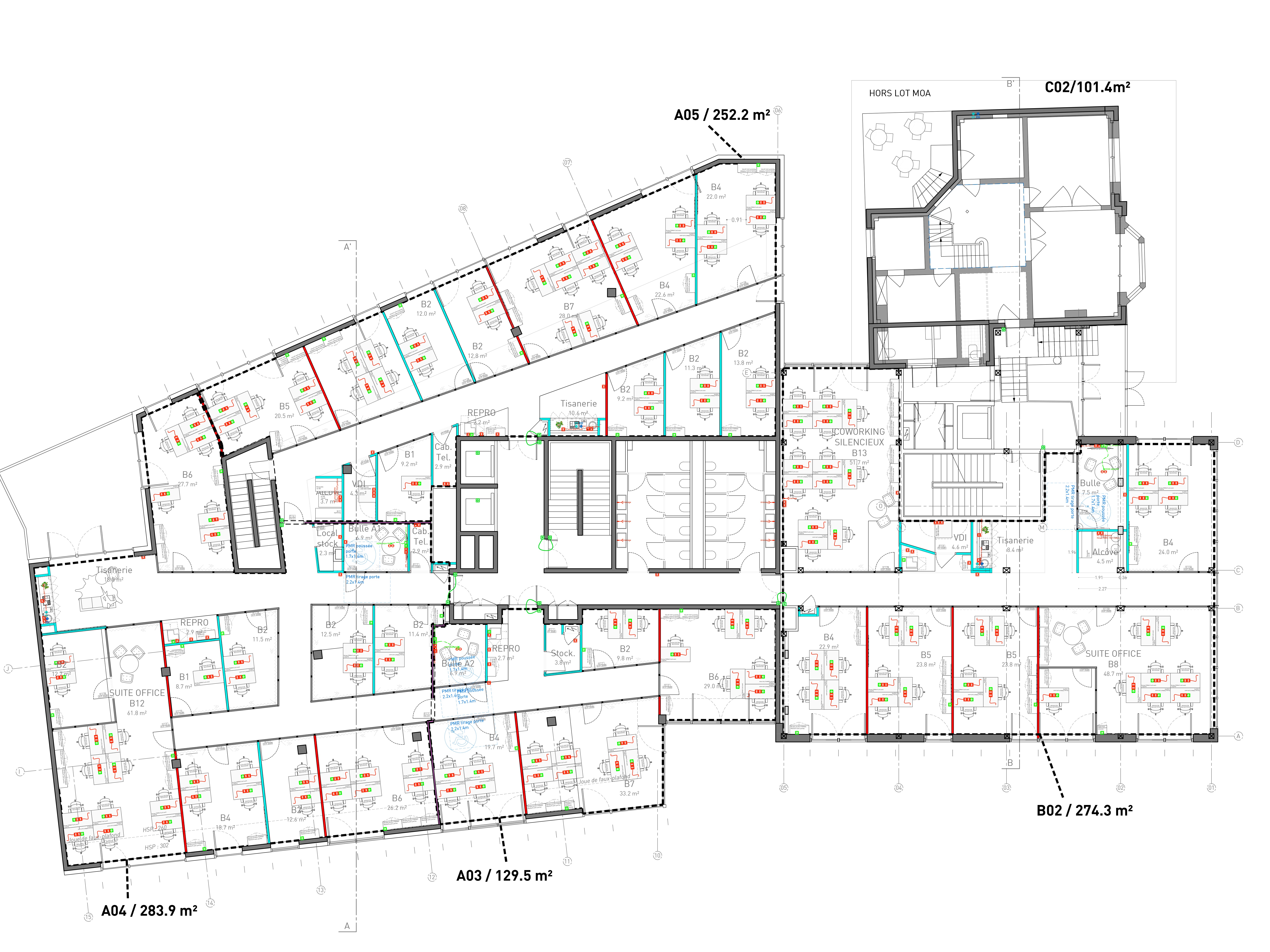 Dans le bâtiment neuf, les espaces de bureaux sont travaillés pour être extrêmement flexibles et reconvertibles. Les éléments techniques sont calepinés en plafond, de telle façon à pouvoir permettre un maximum de flexibilité dans le cloisonnement. Il n’y a pas de faux-plafond afin de donner un maximum de hauteur, et de laisser apparent les sous-faces des dalles.