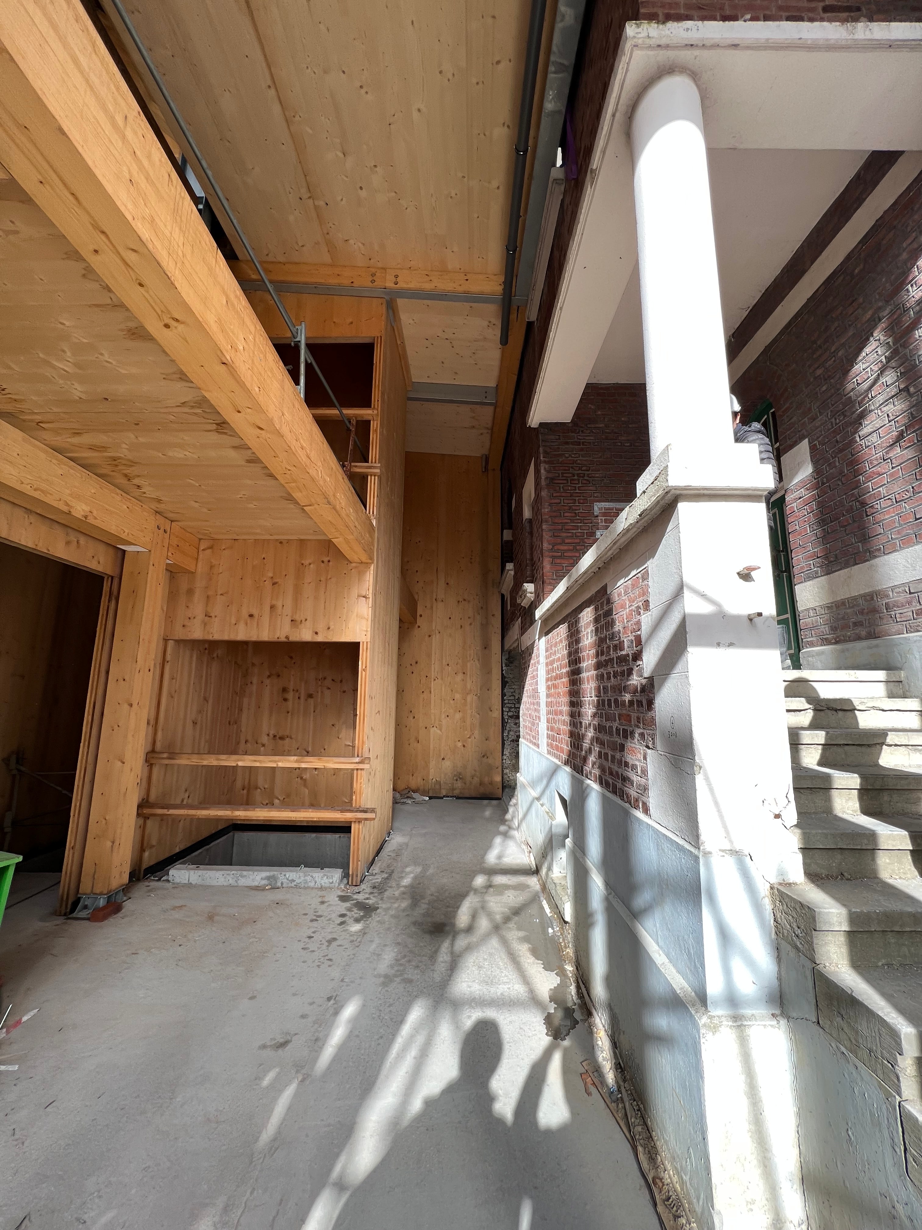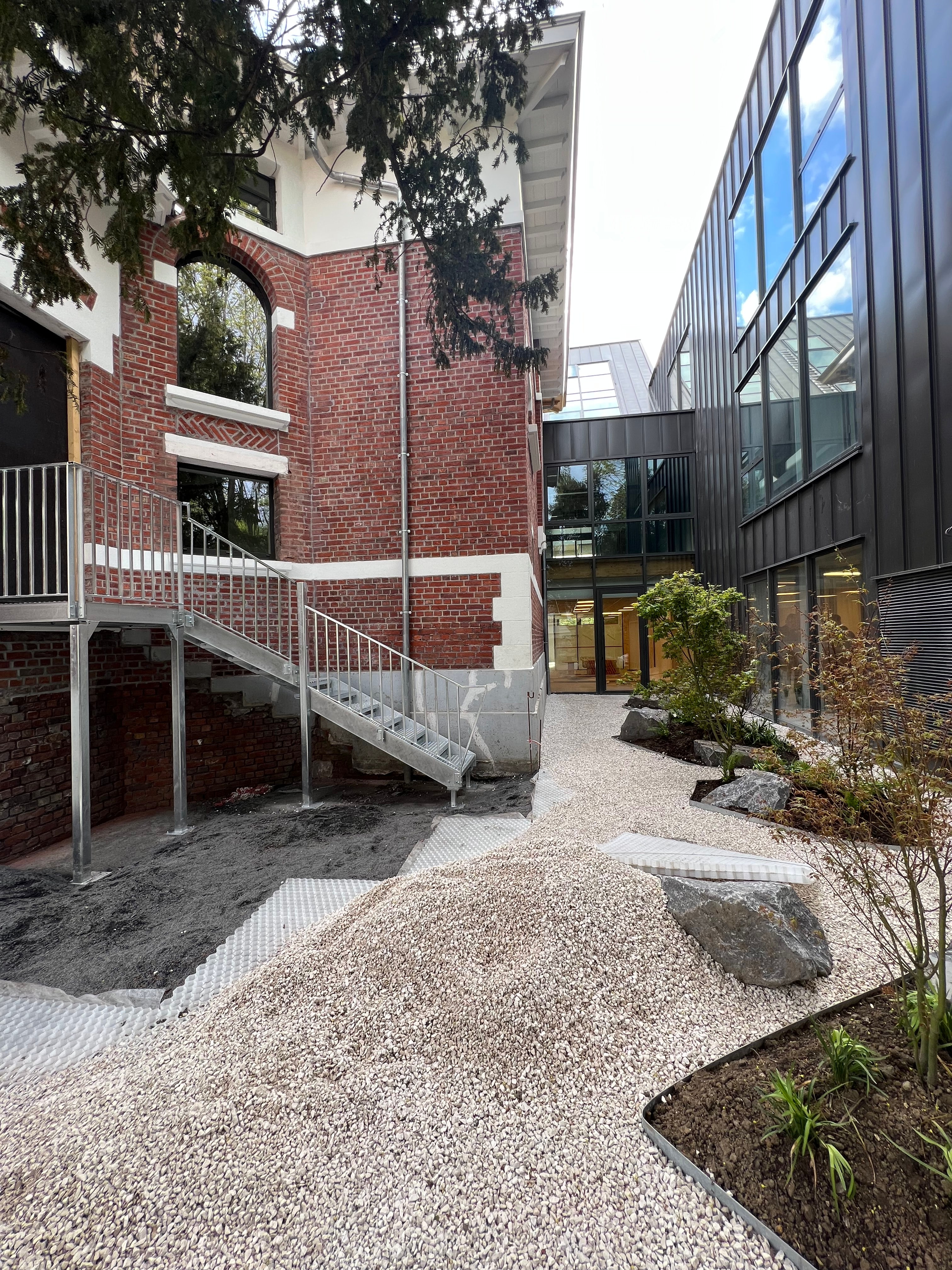 Dans le projet initial, il était prévu que cette maison soit démolie, pour être reconstruite avec une volumétrie identique. Le premier défi a donc été de sécuriser ce bâtiment, afin de travailler avec et de ne pas le démolir. Ses qualités patrimoniales et spatiales étant significatives, nous avons donc mis en valeur ce bâtiment en l’intégrant à la conception générale.
