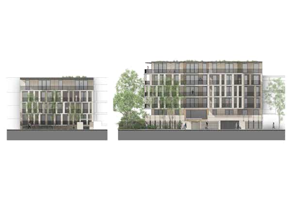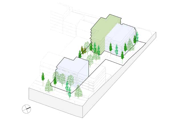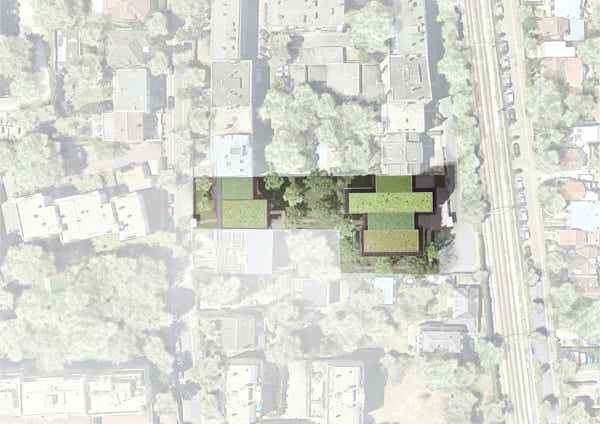 Entre les 2 rues, le terrain est en pente. La disposition très allongée de la parcelle rend complexe l’implantation d’un sous-sol. Un parking commun est mis en place afin d’assurer une continuité et un impact minimal du stationnement. Les 2 bâtiments de part et d’autre émergent au-dessus de ce socle enterré, permettant de dégager au maximum les espaces végétalisés.