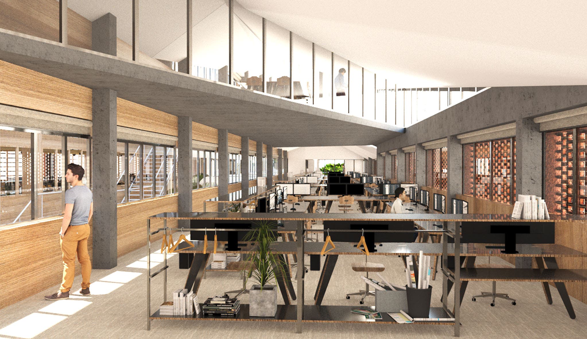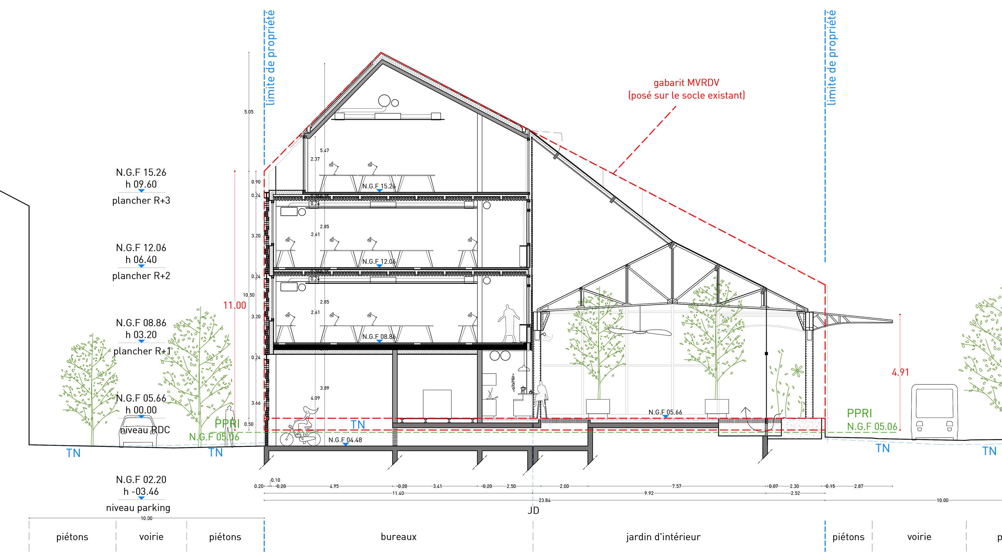 A l’intérieur du gabarit, nous utilisons la halle existante pour créer un espace unique, en communication directe avec tous les espaces de bureaux. Totalement vitrée, cet espace intérieur-extérieur est géré de façon bioclimatique, à l’image d’une serre. Mais il n’est pas question de créer une passoire thermique, inconfortable, ou nécessitant trop de consommation pour y faire baisser la température. Un principe innovant nous a permis de mettre en place un système vertueux, réalisé aux moyens d’études thermodynamiques dans les phases préliminaires du projet. La chaleur produite par les postes de travail est récupérée pour réchauffer cet espace bioclimatique en hiver, et un système de ventilation naturelle permet de rafraîchir ce même espace en configuration estivale, avec l’aide de brasseurs d’air performants, assurant un confort thermique tout au long de l’année, sans système de climatisation.