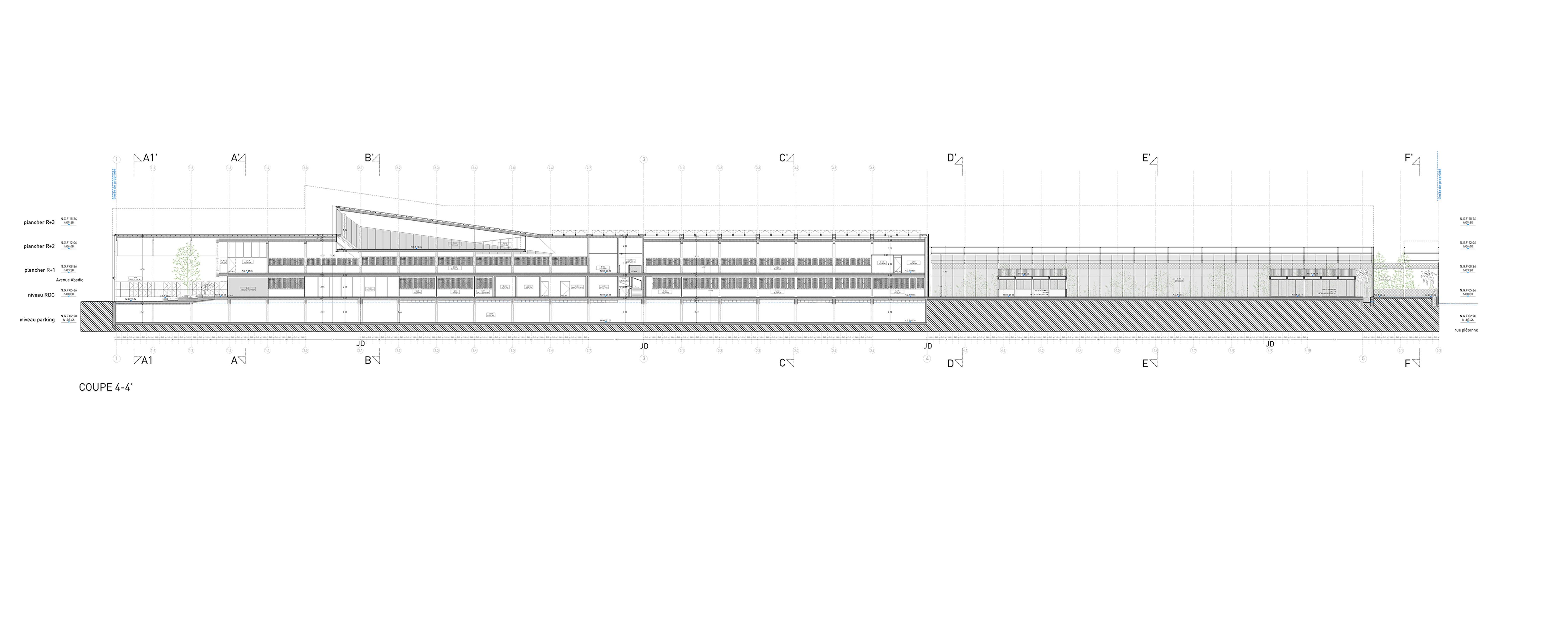 Les espaces de production se déploient sur trois niveaux, surmontés d’une toiture terrasse. Un système de portiques en béton supporte l’ensemble, avec des planchers en prédalles de bois debout, renforcés par une chape de compression, couvrant des portées de 8 mètres. Les façades extérieures sont protégées par des brise-soleil en terre cuite, fixés dans des cadres en acier formant une façade rideau. À l’intérieur, des rideaux permettent de moduler la lumière naturelle, tout en protégeant les artistes-concepteurs 3D.