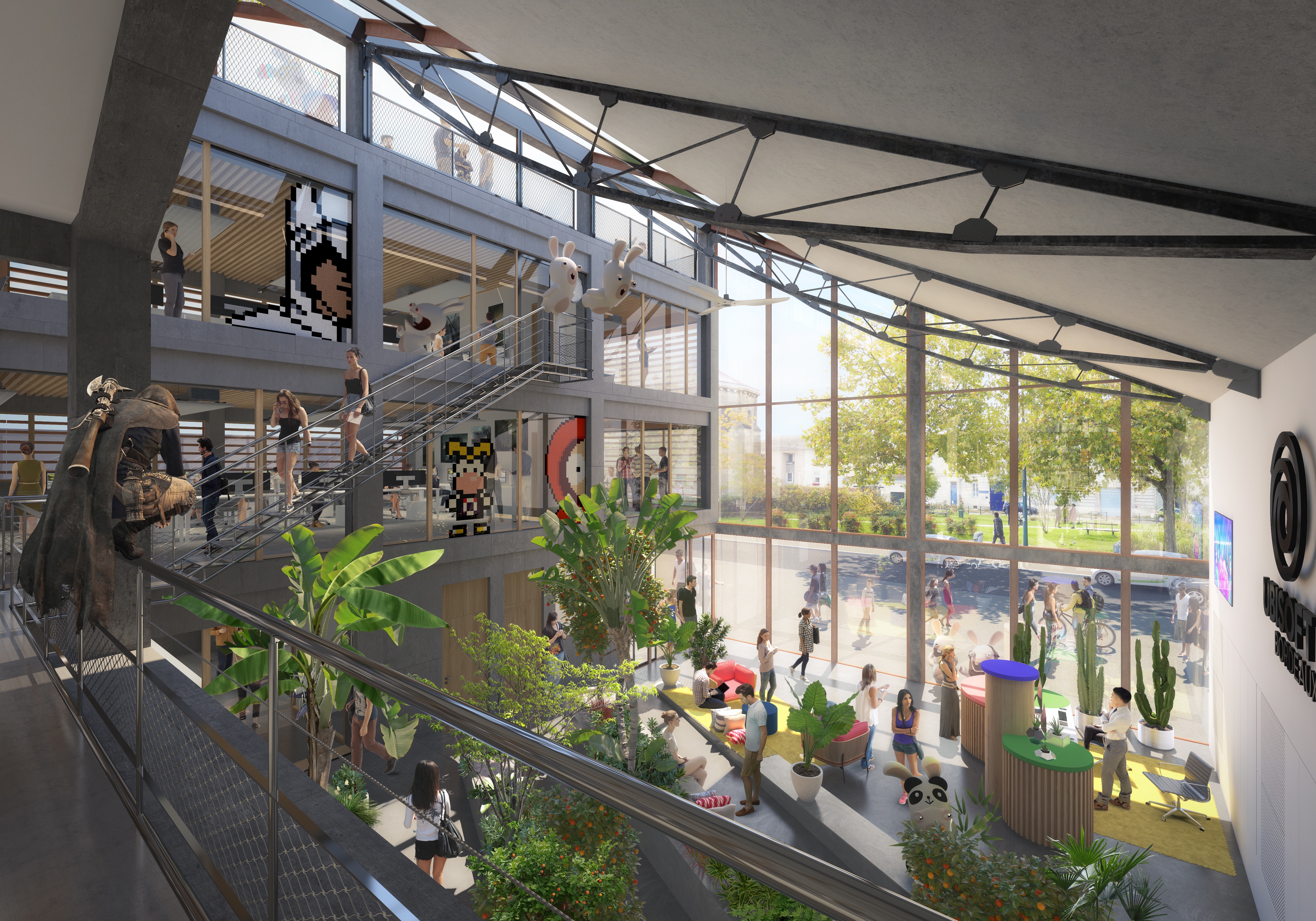 Sous la halle conservée, un jardin intérieur offre un espace de convivialité pour le personnel d’Ubisoft. Cet espace en triple hauteur, entièrement vitré, baigne dans une atmosphère tropicale. Il s’agit d’un lieu où l’on se détend, se rencontre, mange ou travaille, seul ou en groupe. La structure métallique soutient la toiture vitrée et les stores qui protègent du soleil en été, faisant de cet espace bioclimatique un véritable cœur de vie pour le site.