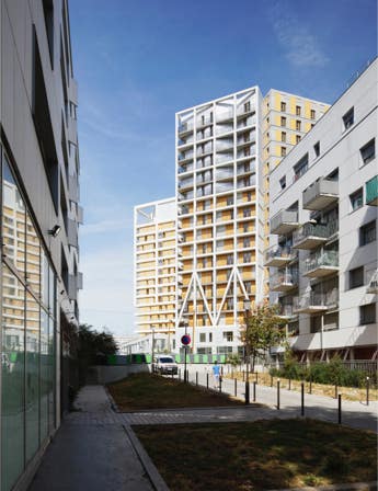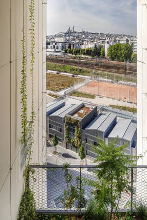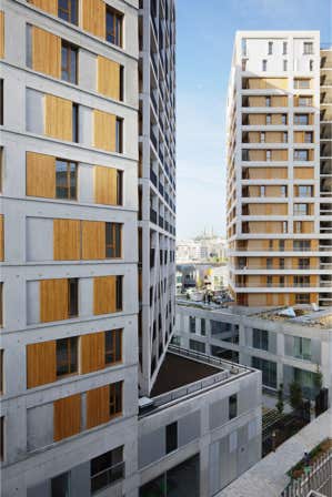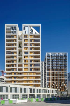 La tour E1 se distingue par une césure centrale, qui divise la masse en deux tourrettes élancées, reliées par un interstice végétalisé et un escalier extérieur. Cette fragmentation dilue la densité et favorise la luminosité des espaces communs. La transition entre le socle SOHO et les tours est assurée par des balcons filants qui créent une skyline basse, en résonance avec l'échelle haussmannienne environnante. Plus haut, la skyline se compose d’un exosquelette en béton préfabriqué blanc, qui dessine des espaces extérieurs généreux, offrant des vues exceptionnelles sur le paysage parisien.