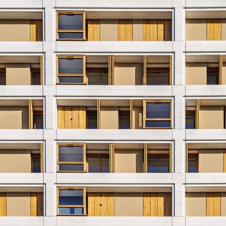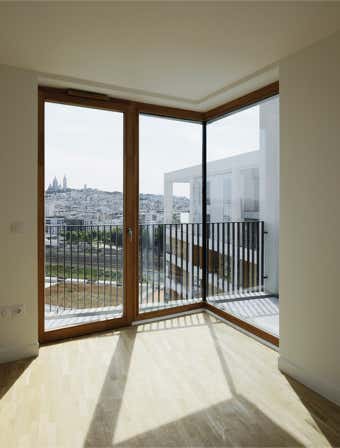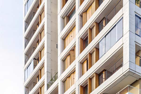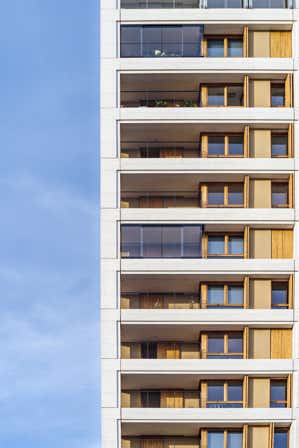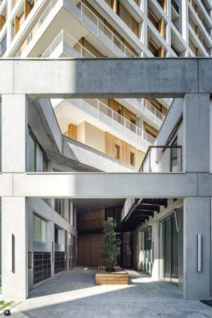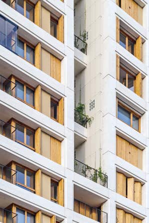 La « tour urbaine » s’aligne sur la rue avec une façade en béton brut perforée de fenêtres généreuses. Les ouvertures sont occultables par des volets coulissants en bois, tandis que des loggias dissimulées offrent des espaces extérieurs intimes.