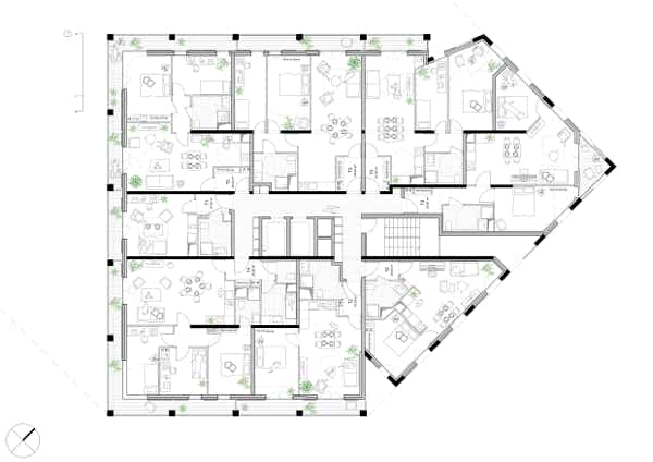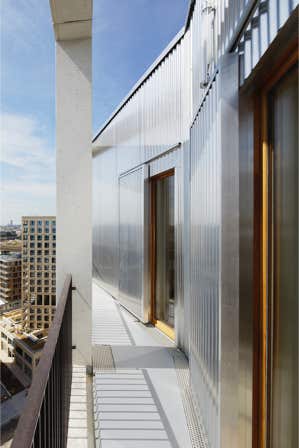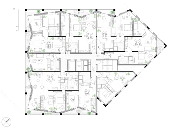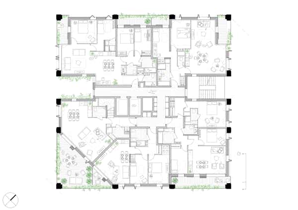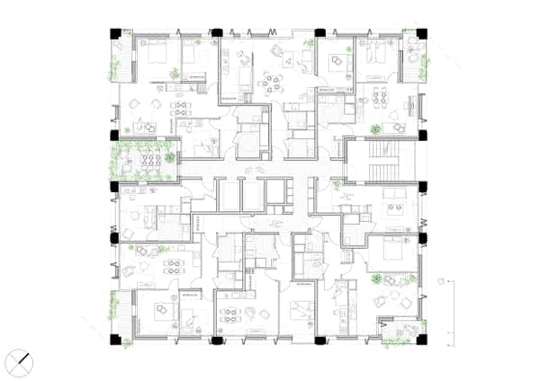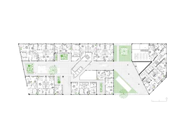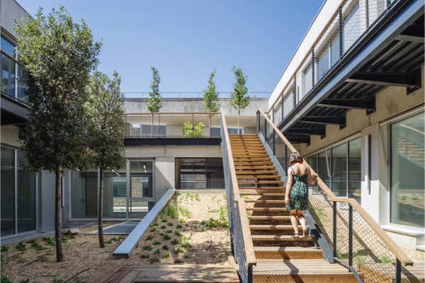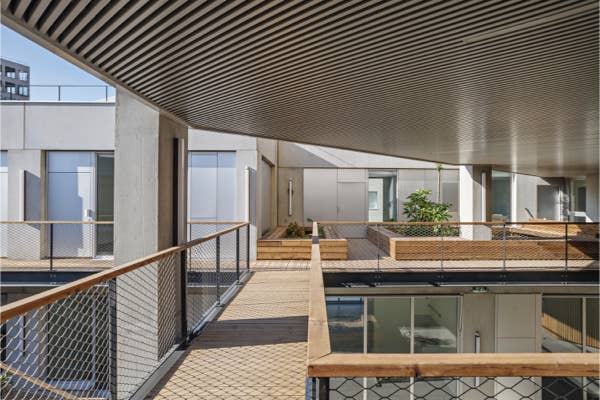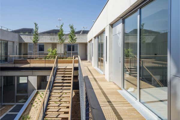 L’ensemble des halls, des logements et des SOHO, sont disposés en vis-à-vis, accentuant la transparence et le lien entre les deux tours. Le socle est ponctué de 20 locaux d’activité, accessibles directement depuis l’espace public, assurant une animation constante. La façade, composée de béton, établit un repère sensoriel à l’échelle du piéton. La toiture du SOHO, en grande partie végétalisée, constitue une cinquième façade, offrant des espaces verts et intégrant discrètement les équipements techniques.
