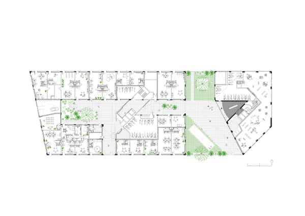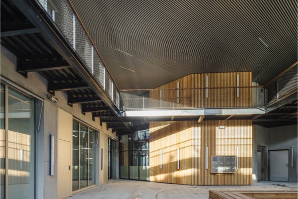 Le concept SOHO (Small Office/Home Office) associe activité professionnelle et habitation. Ce programme innovant active les rez-de-chaussée dans ce quartier enclavé, favorisant la mixité et l'animation urbaine. Le socle SOHO est traversé par une grande rue intérieure, évoquant les cours parisiennes. Cette rue, artère de desserte et lieu de vie, crée une porosité entre les différents espaces et offre lumière et ouverture aux locaux d'activités et logements.