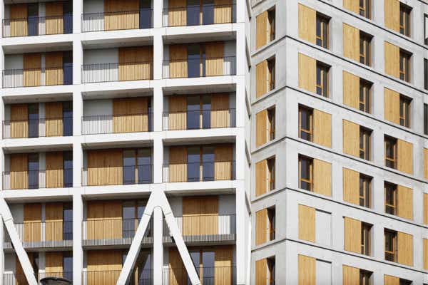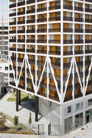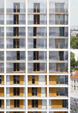 La matérialité du projet a été la base permettant d’assurer une cohérence entre les 2 tours, qui ont chacune des variations avec un langage commun. Le béton brut préfabriqué, le bois, et la serrurerie en acier fabriquent les composantes principales des différentes compositions architecturales. L’exostructure permettant de mettre en valeur les éléments de béton, et assurant une cohérence esthétique et intemporelle.