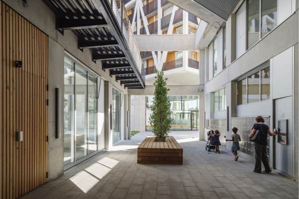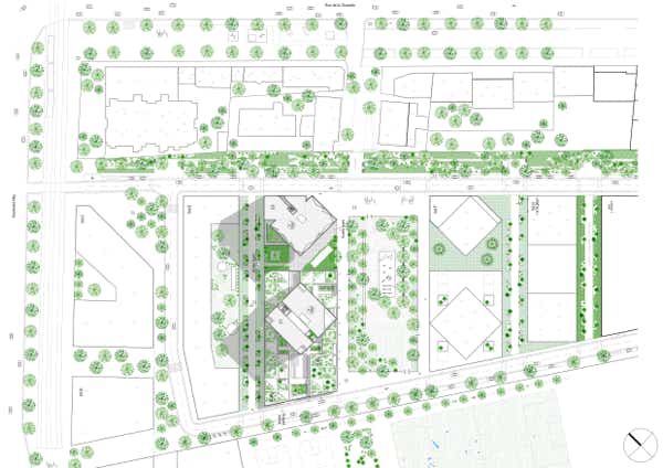 La rue centrale reliant l’ensemble des circulations internes du projet est un évènement architectural inédit. Elle passe sous les 2 émergences, créant ainsi des espaces couverts en double-hauteur, exploitable par les habitants. Elle débouche sur un jardin central entre les 2 tours, qui se transforme en lieu de rencontre et en espace de vie pour tous les habitants. Un terrain de pétanque est positionné la, donnant un côté domestique et fédérateur du lieu.