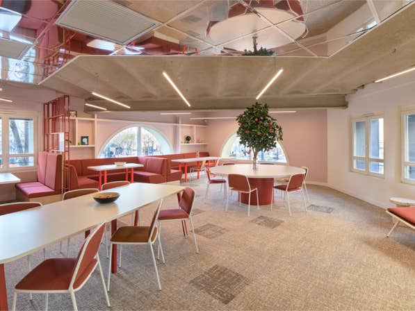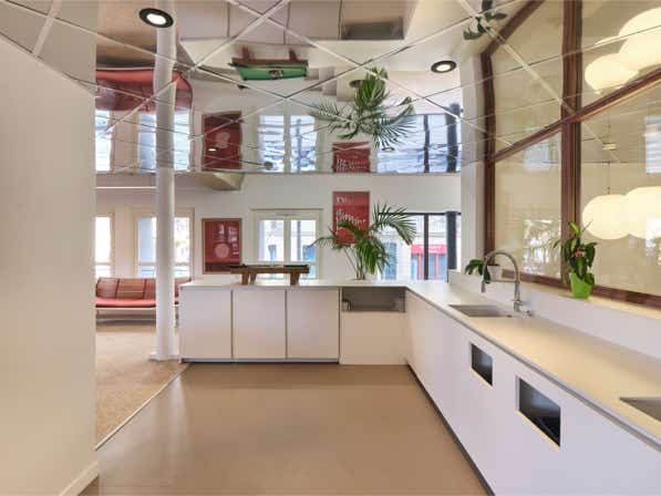 La dernière intervention sur ce site repositionne l’accueil, les espaces de restauration et les salles de réunion à l’entresol, libérant les étages pour des bureaux et des espaces communs plus discrets. Cette réorganisation crée une nouvelle séquence d’entrée : dès son arrivée, le visiteur identifie immédiatement l’univers de Newton Offices. Un escalier mène du hall de rue à l’accueil, accompagné d’un plafond en miroir qui reflète les aménagements de l’étage, assurant une transition douce.