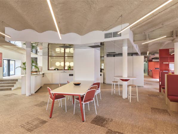 Le plafond révèle l’histoire du lieu, mêlant bac acier, voutains, et poutres en acier. Pour atteindre le degré coupe-feu requis, l'agence a opté pour un flocage à la teinte naturelle, conservant ainsi la volumétrie de la structure et témoignant des travaux successifs.
