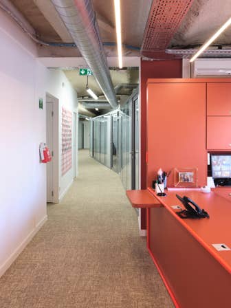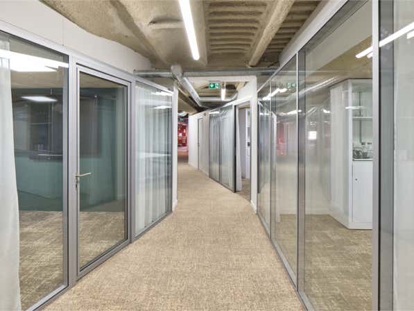 Dans la gestion du cloisonnement, nous avons mis en place un principe de cloisons vitrées amovibles avec une finition donnant une lecture de « boite dans la boite ». A dessus des cloisons, un système de linteau en retrait traité en placo permet de gérer le passage des réseaux, et de décoller le plafond, accentuant d’avantage la sensation d’espace. Cela permet aussi de gérer les questions acoustiques à l’endroit des passages des réseaux.