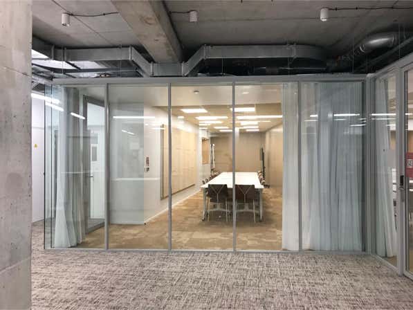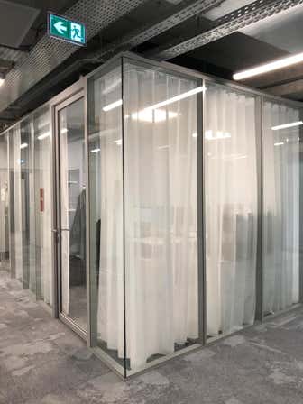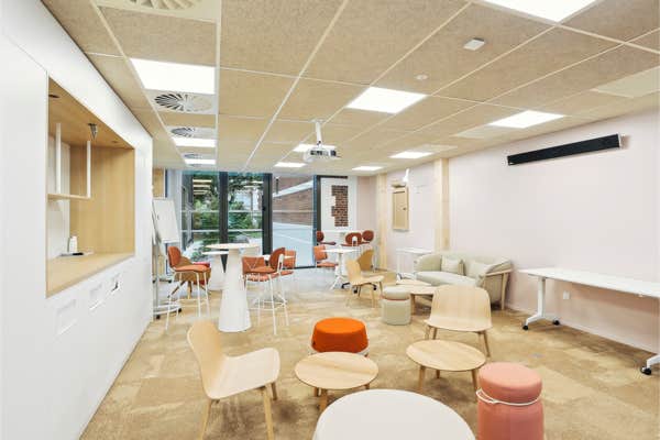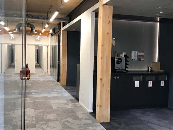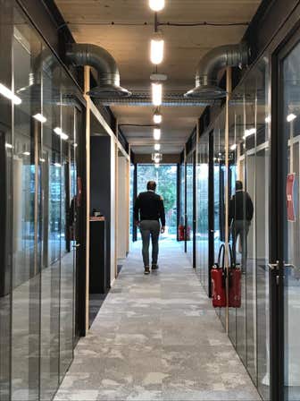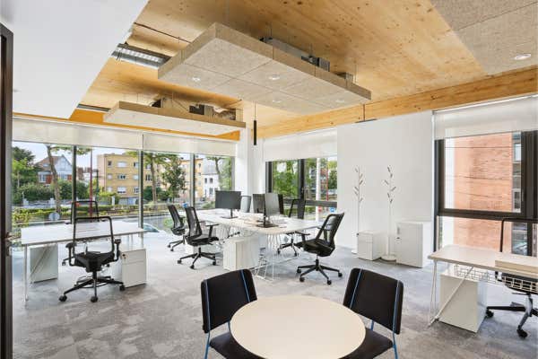 Dans le bâtiment neuf, les espaces de bureaux sont travaillés pour être extrêmement flexibles et reconvertibles. Les éléments techniques sont calepinés en plafond, de telle façon à pouvoir permettre un maximum de flexibilité dans le cloisonnement. Il n’y a pas de faux-plafond afin de donner un maximum de hauteur, et de laisser apparent les sous-faces des dalles.