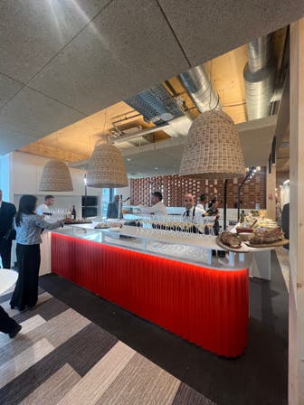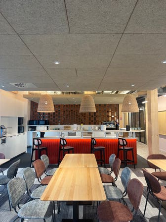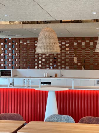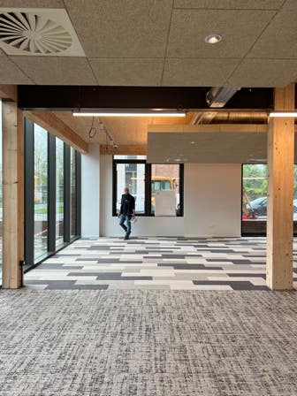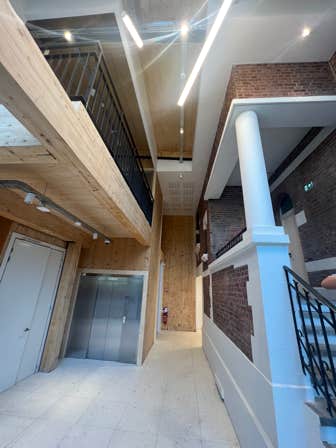 Grace au système de calepinage des éléments techniques, l’ensemble des dalles sont laissées apparentes en sous-face. Grace à un système d’éclairage indirect, ces sous-faces sont mises en valeur pour donner un côté industriel dans la partie béton, et chaleureux dans la partie bois.