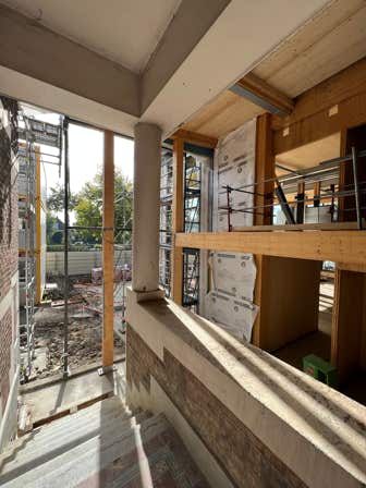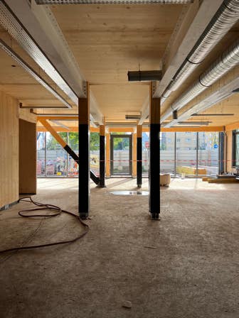 Le projet est constitué de 3 éléments. La maison existante, un volume en bois, et un volume en béton. Si la partie en béton est assez classique, celle en bois est plus ambitieuse. Totalement en bois, les dalles sont en CLT, permettait d’avoir d’importantes portées. Les poteaux sont en bois massif, et l’escalier en baubuche. Certains voiles verticaux en CLT constituent le contreventement.