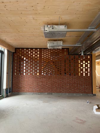 L’intégration de volumes existant permet de créer des espaces uniques, et forcément sur mesure. Entre le projet neuf et la partie existante, il y a un espace résiduel, un lien à inventer. Cet entre-deux devient le hall principal du projet, et donne a lire un espace en double hauteur atypique, puisque la façade existante de la maison en constitue une de ses façades. Le bâtiment neuf, tout en bois, s’y confronte à l’existant.