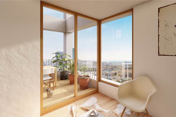 Tous les appartements disposeront d’un accès généreux sur l’extérieur. Mais si la vue est belle, il faut aussi se protéger du climat. Au nord de chaque terrasse, des séparatifs stopperont le mistral tandis qu’au sud, des jardinières préserveront le vis-à-vis. De plus, l’épaisseur d’une exo-structure produira ombre et fraicheur. Si les espaces extérieurs font l’objet d’une grande attention c’est parce qu’ils sont une pièce à part entière du logement. Au niveau bas de la tour, les logements sont en duplex afin d’offrir de généreuses double-hauteur. Aussi bien intérieur qu’extérieur, ces grandes hauteurs permettent de profiter encore plus du panorama. Les appartements sont conçus pour profiter au maximum de l’extérieur et diversifier les vues.
