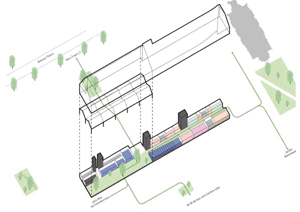 La préservation du patrimoine industriel ne se limite pas aux bâtiments exceptionnels, mais s’étend à la mémoire collective des générations de travailleurs qui ont animé ces lieux. Sur ce site, la compagnie des chemins de fer Paris Orléans exploitait au début du XXème siècle des hangars soigneusement construits, avec des assemblages fins et des matériaux de qualité. Les fermes de la charpente, en bon état de conservation, seront restaurées et réutilisées pour soutenir la toiture en verre du jardin intérieur, magnifiant cet espace, notamment dans la cafétéria.