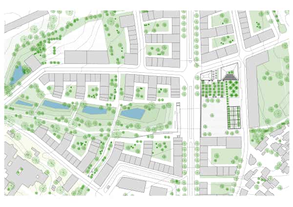 Située dans le cœur ancien, la Maison de Santé s'inscrit dans un tissu urbain dense, marqué par des rues étroites et un bâti bas de deux à trois niveaux. La pente ascendante de la commune vers le bois de Sainte-Croix offre des vues panoramiques. Pour s'intégrer à ce paysage, le bâtiment respecte deux principes : s'aligner sur les trois rues pour marquer la grille historique, et limiter la hauteur au rez-de-chaussée pour préserver les vues vers le paysage.
