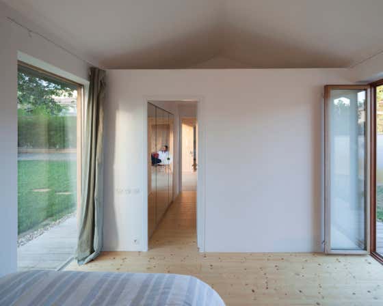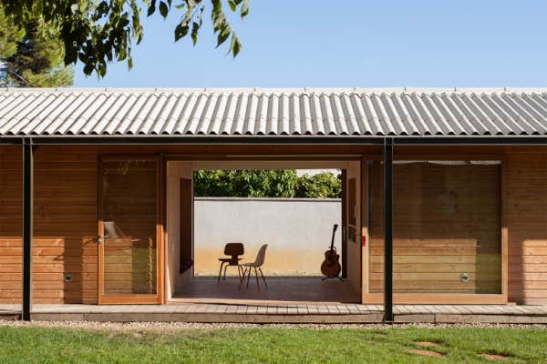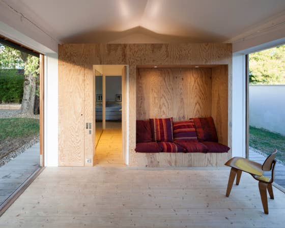 La pièce centrale du pavillon est totalement traversante et ouvrable. Ses façades vitrées à l’Est et à l’Ouest sont totalement escamotables, avec une partie battante et un grand coulissant. Le volume intérieur bénéficie de l’espace sous toiture pour donner une sensation de hauteur plus importante. Durant les belles journées, lorsque la pièce est entièrement ouverte, l’espace devient un intérieur extérieur abrité, permettant de profiter au maximum du rapport avec le jardin.