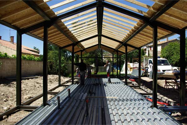 Le projet s’insère dans une zone urbaine pavillonnaire calme, à proximité du centre-ville d’Eyguières. Afin de minimiser les nuisances du chantier, nous avons opté pour une structure préfabriquée en acier, qui a fait l’objet d’une longue conception, mais d’une mise en œuvre en 24h sur site. Le terrain étant de mauvaise composition, les fondations profondes ont pu être limitées au strict minimum grâce à la légèreté de la structure.