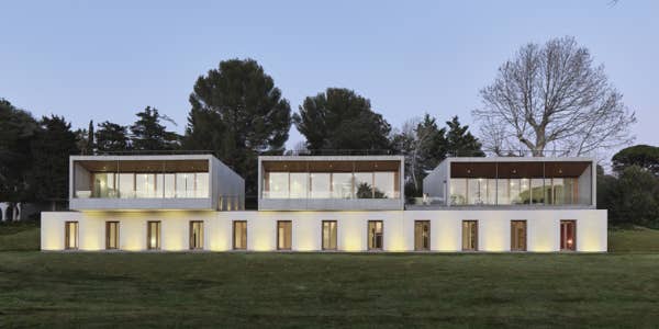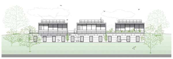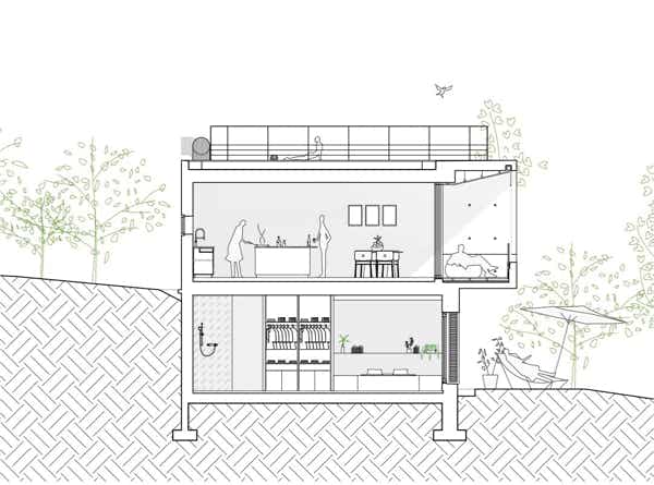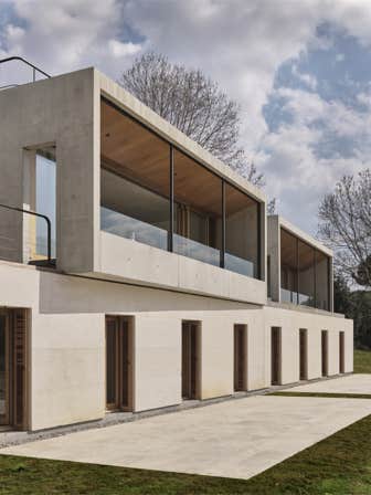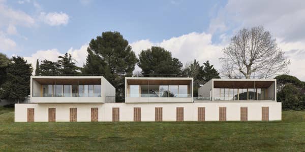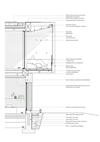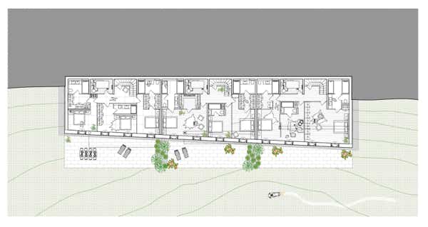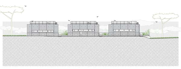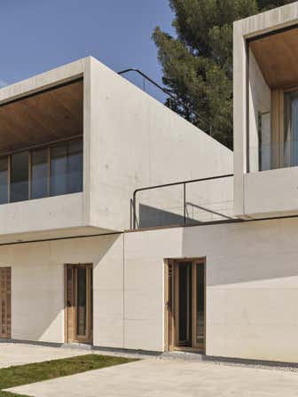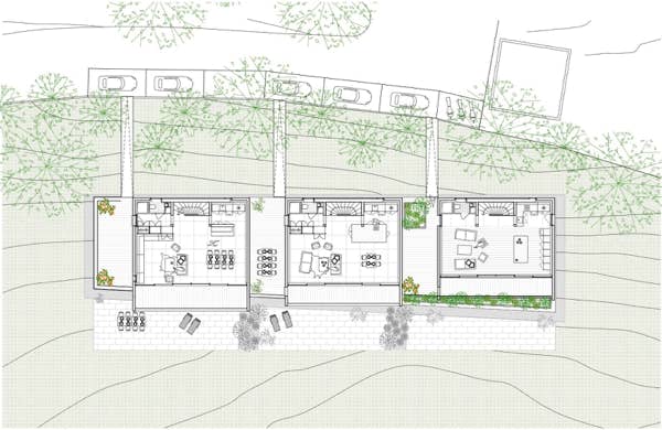 Le projet repose sur un socle en pierre massives, avec trois volumes de béton posés dessus. Le bois, chaleureux, habille les menuiseries. Un peigne de béton soutient le rez-de-jardin, abritant les espaces techniques et les circulations, tandis que l’inertie de la pierre massive assure l’isolation des chambres, permettant une finition apparente à l’intérieur comme à l’extérieur. Des voiles de béton fusible séparent les maisons, leur offrant une flexibilité future, prête à s’adapter aux besoins de demain.