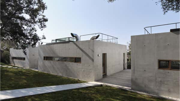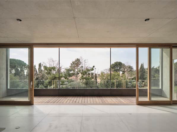 Six refends de béton soutiennent les poutres, solides et discrètes, sur lesquelles reposent les planchers. La loggia des salons, suspendue, s’avance en porte-à-faux, offrant une vue qui coupe le souffle, sur le paysage qui s’étend à perte de vue.