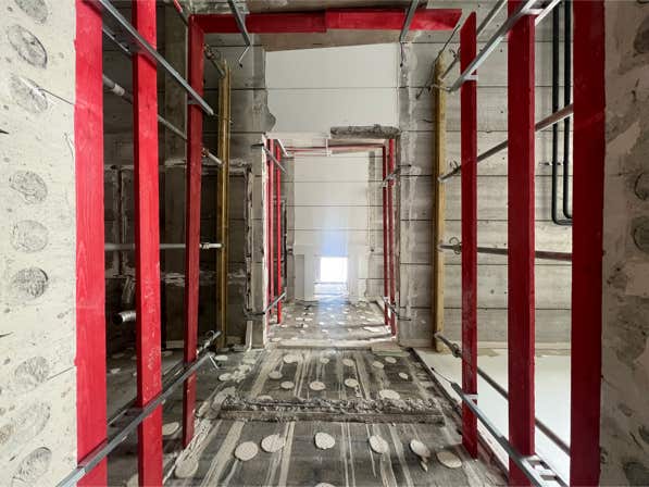 Les façades sont réalisées en pierre de taille. Chaque élément est légèrement taillé en courbe, afin d’assurer un aspect arrondi et accueillant. Ces éléments sont porteurs, et permettent de dégager les façades en retrait de tout rôle structurel, permettant de mettre en œuvre des ouvertures généreuses, et une flexibilité dans le temps long permettant d’assurer une pérennité du bâtiment.