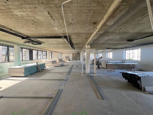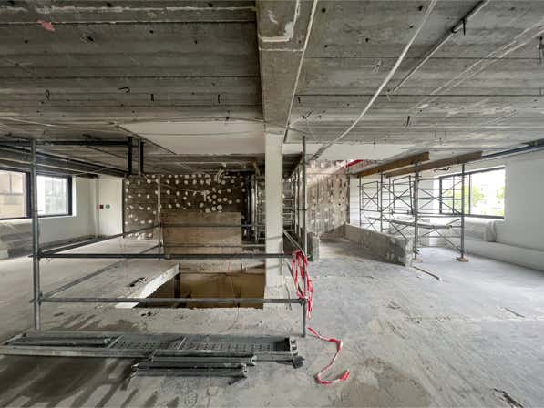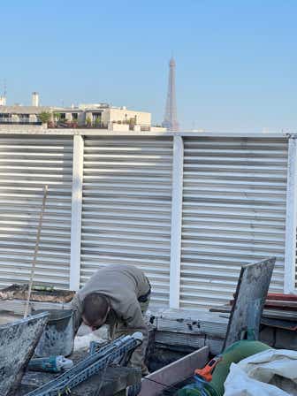 Entre les 2 rues, le terrain est en pente. La disposition très allongée de la parcelle rend complexe l’implantation d’un sous-sol. Un parking commun est mis en place afin d’assurer une continuité et un impact minimal du stationnement. Les 2 bâtiments de part et d’autre émergent au-dessus de ce socle enterré, permettant de dégager au maximum les espaces végétalisés.