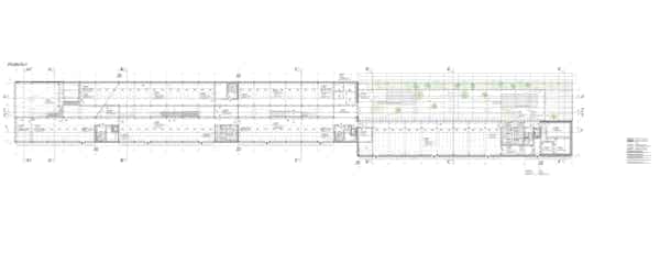 L’espace de convivialité en triple hauteur situé sous la halle existante profite de la charpente existante. Cette dernière, renforcée par sa jonction avec la structure béton, supporte la toiture vitrée ainsi que les façades. Une analyse éléments par éléments a été réalisé afin de déterminer les éléments d’acier à remplacer ou rénover, afin de conserver l’esthétique légère de cette halle industrielle, et la mettre au service de cet espace atypique et contemporain.
