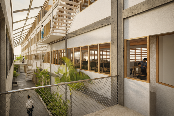 Les espaces de production se déploient sur trois niveaux, surmontés d’une toiture terrasse. Un système de portiques en béton supporte l’ensemble, avec des planchers en prédalles de bois debout, renforcés par une chape de compression, couvrant des portées de 8 mètres. Les façades extérieures sont protégées par des brise-soleil en terre cuite, fixés dans des cadres en acier formant une façade rideau. À l’intérieur, des rideaux permettent de moduler la lumière naturelle, tout en protégeant les artistes-concepteurs 3D.