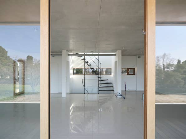 Six refends de béton soutiennent les poutres, solides et discrètes, sur lesquelles reposent les planchers. La loggia des salons, suspendue, s’avance en porte-à-faux, offrant une vue qui coupe le souffle, sur le paysage qui s’étend à perte de vue.